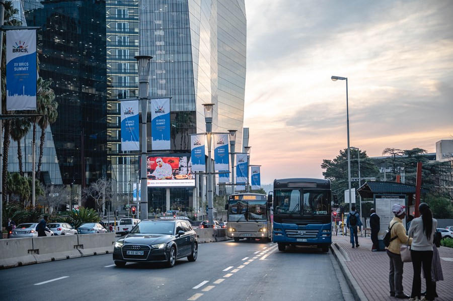 Signboards of the 15th BRICS summit are seen on a street of Johannesburg, South Africa, Aug. 17, 2023. (Xinhua/Wang Guansen)