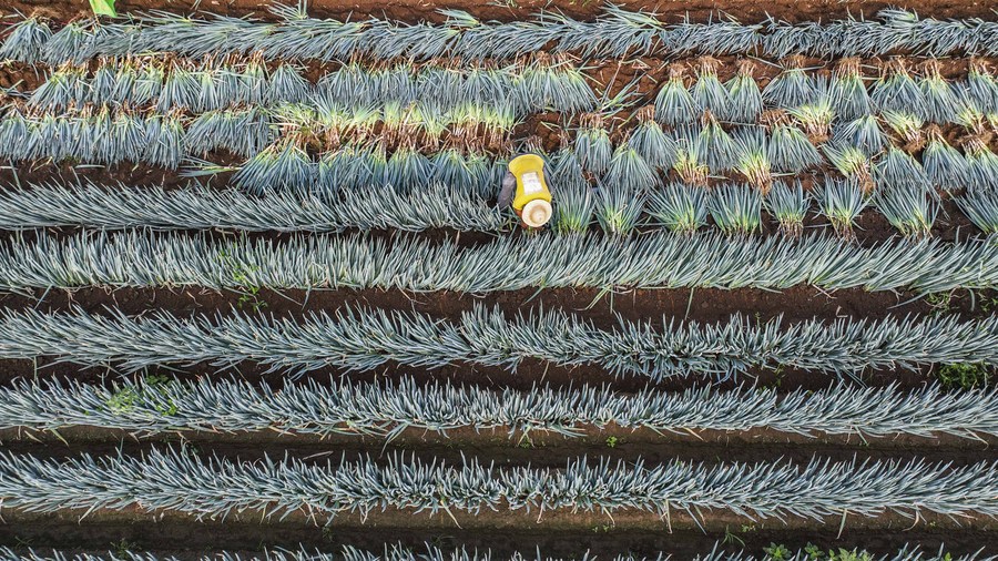 This aerial photo taken on Aug. 20, 2023 shows a farmer harvesting scallion at a field in Zunhua City, north China's Hebei Province. (Photo by Liu Mancang/Xinhua)