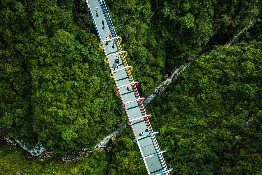 This aerial photo taken on Aug. 20, 2023 shows tourists playing at a scenic area in Jianshi County of Enshi Tujia and Miao Autonomous Prefecture, central China's Hubei Province. (Xinhua/Xiao Yijiu)