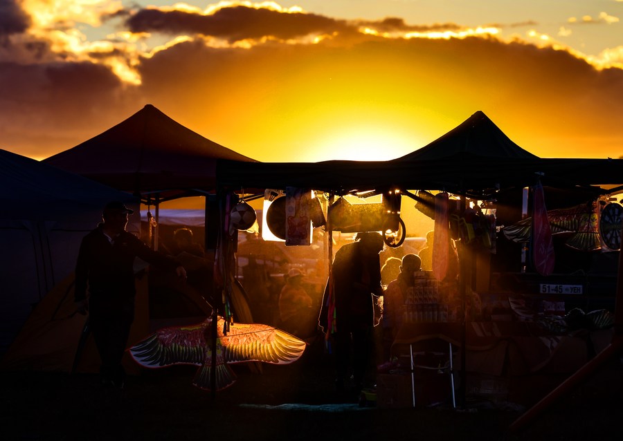A souvenir shop is still open at sunset in the Nalaikh District of Ulan Bator, Mongolia, on Aug. 18, 2023. (Xinhua/Lan Hongguang)
