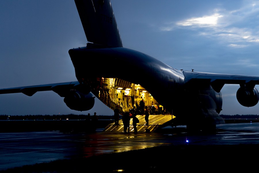 This photo taken on Aug. 18, 2023 shows an aircraft getting ready for the relocation of hospital patients from the Yellowknife hospital to Vancouver at the Yellowknife airport in Yellowknife, Northwest Territories, Canada. The Canadian Armed Forces participated in an evacuation operation, helping residents out of Yellowknife as wildfires approached the city. (Canadian Armed Forces/Handout via Xinhua)
