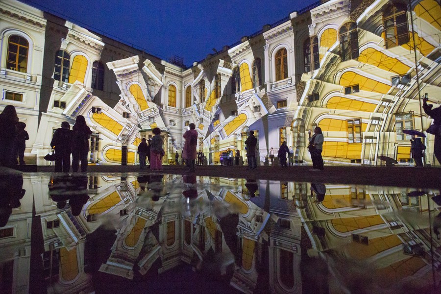 People visit a light show at the Gatchina Palace and Estate Museum near St. Petersburg, Russia, Aug. 19, 2023. The Gatchina Palace and Estate Museum hosted an international light art festival from Aug. 17 to Aug. 19, attracting multimedia professionals from various countries to demonstrate their artworks. (Photo by Irina Motina/Xinhua)