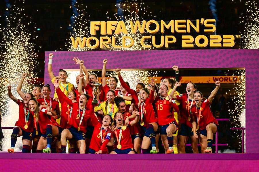 Team Spain celebrate during the awarding ceremony of the 2023 FIFA Women's World Cup in Sydney, Australia, Aug. 20, 2023. (Xinhua/Zhu Wei)