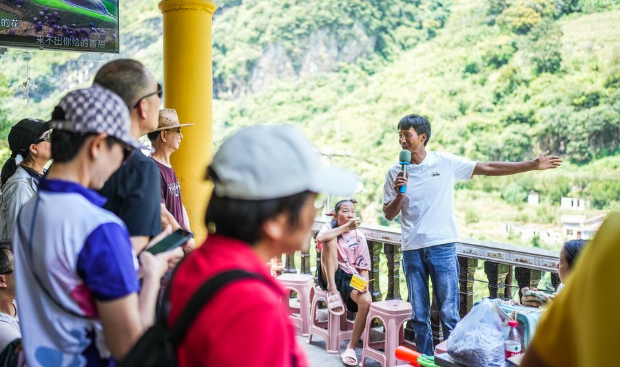 Ma Xuanjun talks about the Beipanjiang Bridge and his hometown to tourists in Longjing Village of Liupanshui City, southwest China's Guizhou Province, Aug. 16, 2023.