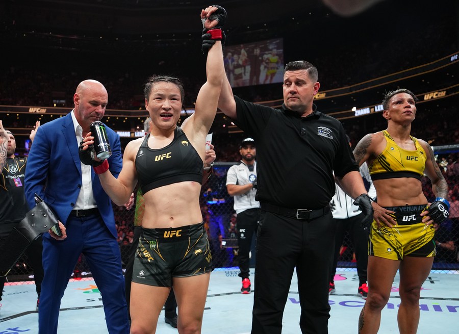Zhang Weili(L, front) reacts after her victory over Amanda Lemos of Brazil in the strawweight title fight at the UFC 292 in Boston, the United States, Aug. 19, 2023. (Xinhua)