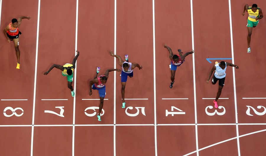 Noah Lyles (3rd L) of the United States competes during the Men's 100m Final of the World Athletics Championships Budapest 2023 in Budapest, Hungary, Aug. 20, 2023. (Xinhua/Wang Lili)■