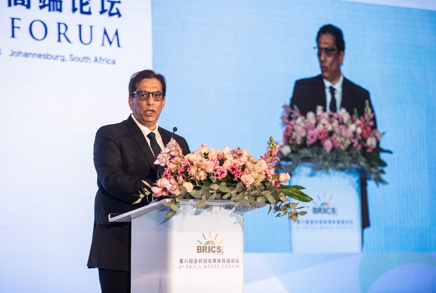 Iqbal Surve, executive chairman of Independent Media of South Africa, speaks at the opening ceremony of the Sixth BRICS Media Forum in Johannesburg, South Africa, Aug. 19, 2023. (Xinhua/Wang Guansen)