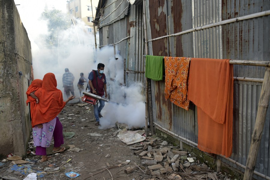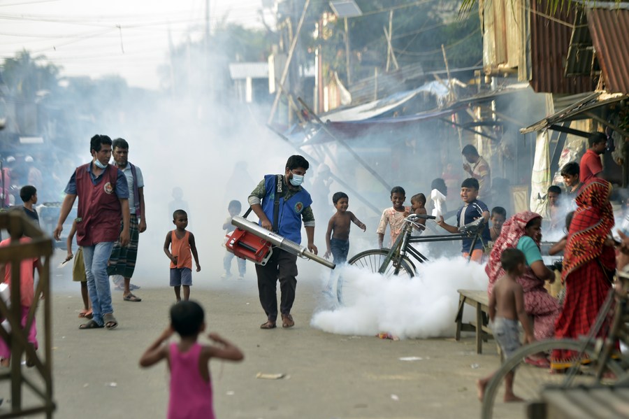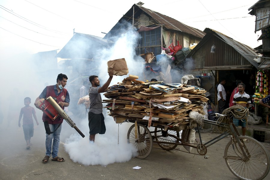 Workers spray anti-mosquito fog in Dhaka, Bangladesh, on Aug. 20, 2023. (Xinhua)