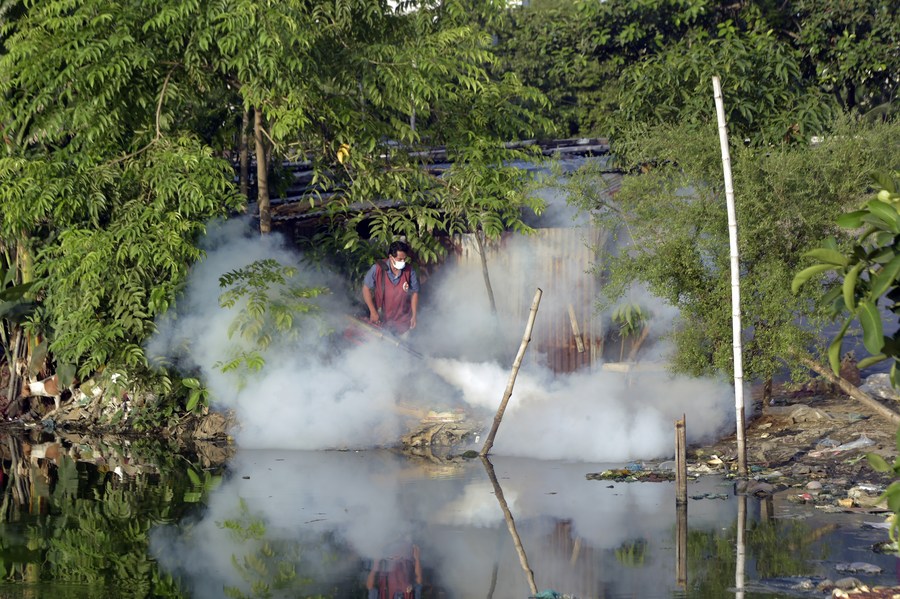 A worker sprays anti-mosquito fog in Dhaka, Bangladesh, on Aug. 20, 2023. (Xinhua)