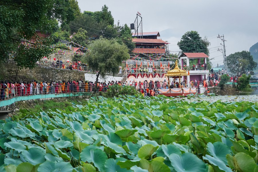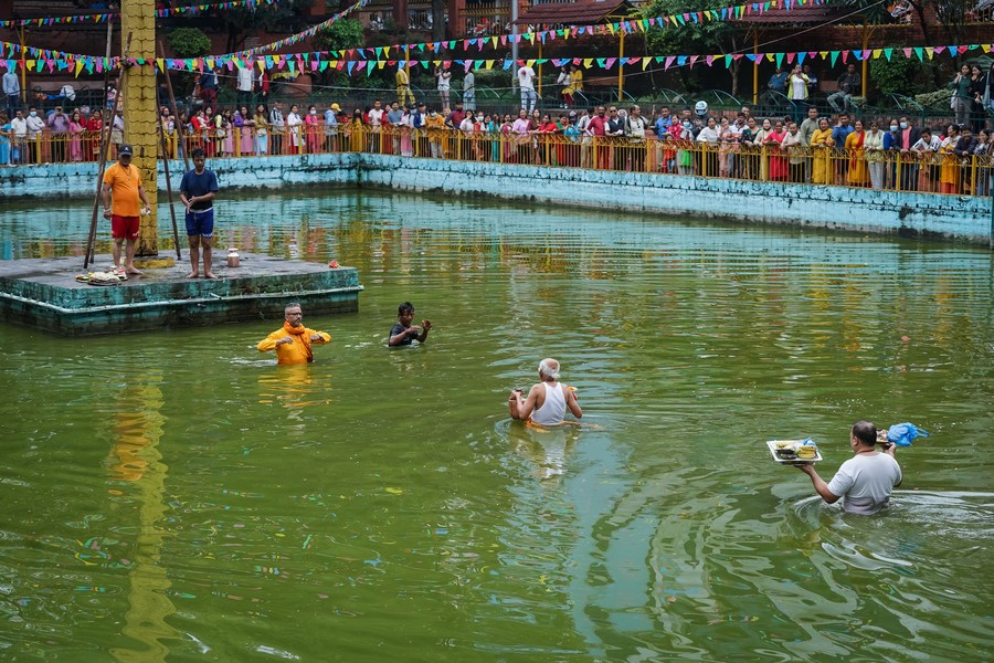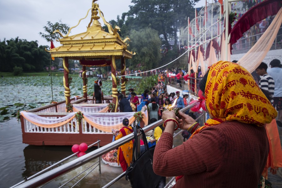 Devotees queue up to worship naga (serpent) on the occasion of Naga Panchami at Nagdaha Lake in Lalitpur, Nepal, Aug. 21, 2023. (Photo by Hari Maharjan/Xinhua)