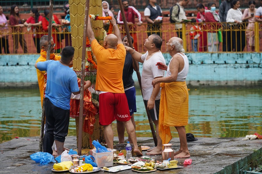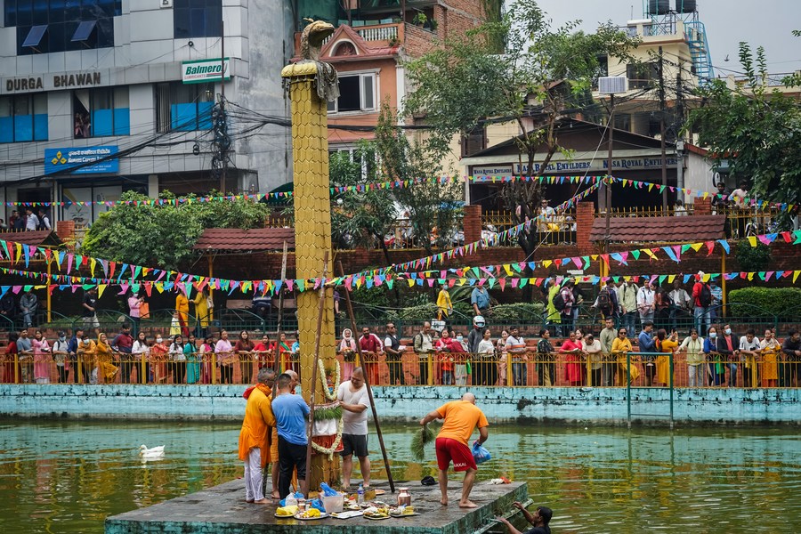 People perform a ritual to mark Naga Panchami in Bhaktapur, Nepal, Aug. 21, 2023. (Photo by Sulav Shrestha/Xinhua)■