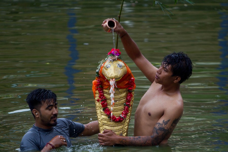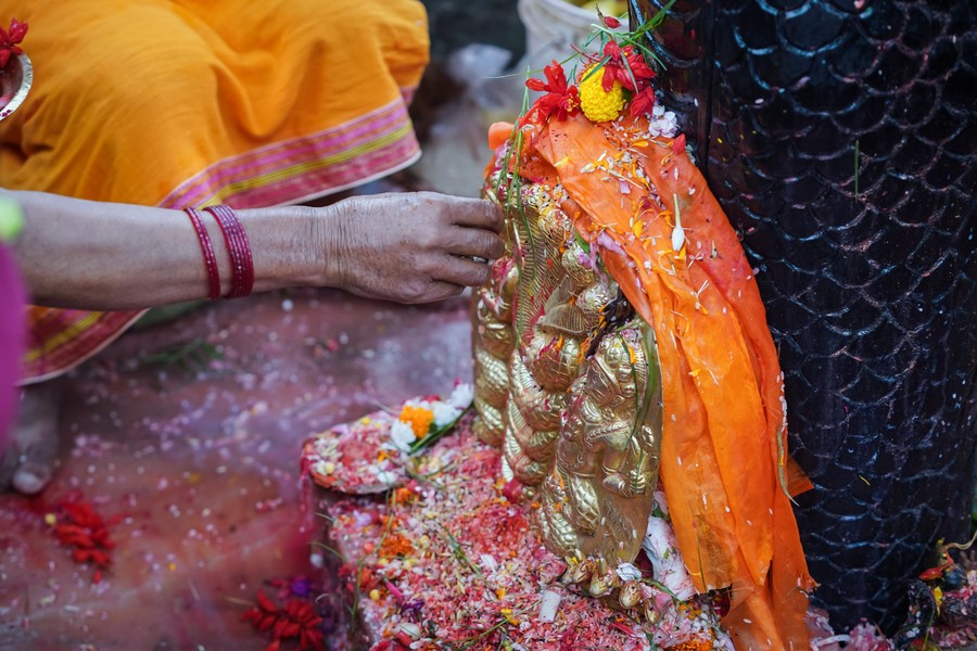 A devotee worships naga (serpent) on the occasion of Naga Panchami at Nagdaha Lake in Lalitpur, Nepal, Aug. 21, 2023. (Photo by Hari Maharjan/Xinhua)