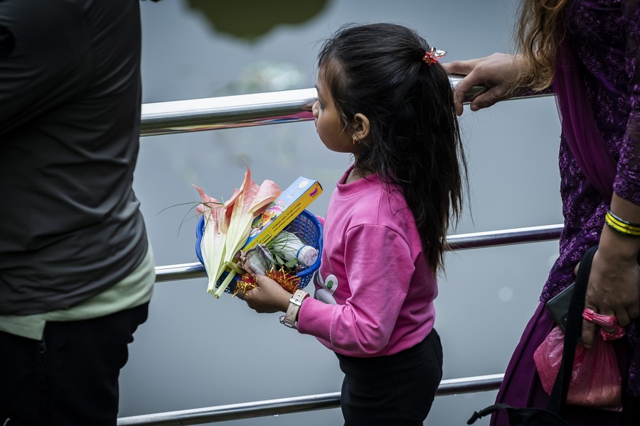 A girl is seen queuing up to worship naga (serpent) on the occasion of Naga Panchami at Nagdaha Lake in Lalitpur, Nepal, Aug. 21, 2023. (Photo by Hari Maharjan/Xinhua)