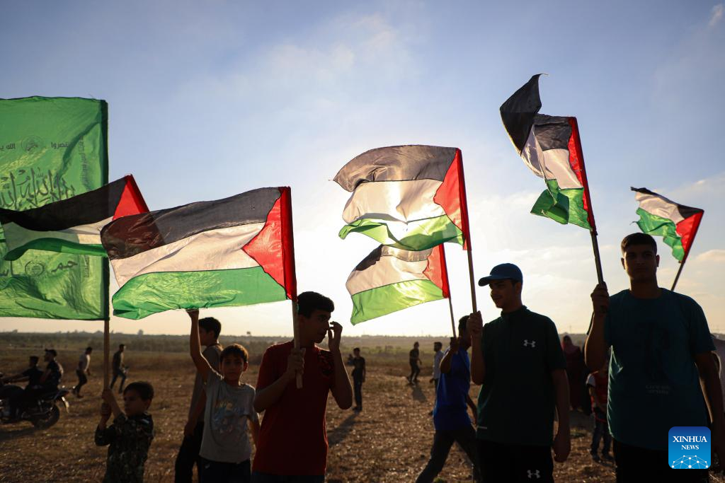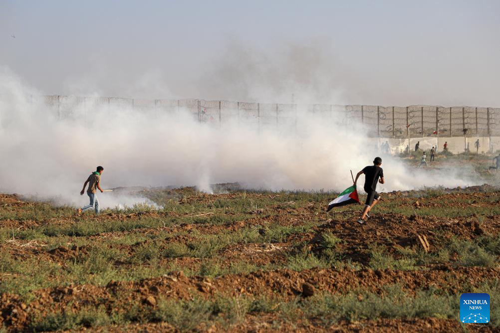 Palestinians take part in a protest to mark the 54th anniversary of the burning of Al-Aqsa Mosque near the fence of the Gaza-Israel border, east of Gaza City, on Aug. 21, 2023. Dozens of Palestinians were injured on Monday during clashes with the Israeli soldiers at the Gaza border with Israel and the West Bank, Palestinian medics and eyewitnesses said. (Photo by Rizek Abdeljawad/Xinhua)