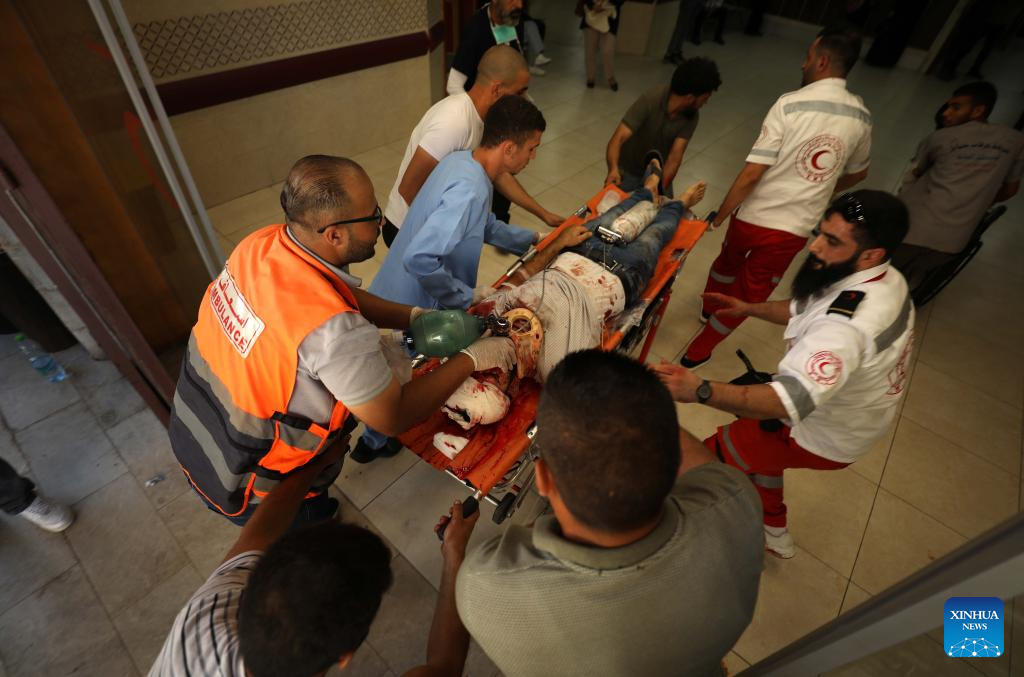 Palestinian medics transfer an injured man to a hospital in the West Bank city of Nablus, on Aug. 21, 2023. Dozens of Palestinians were injured on Monday during clashes with the Israeli soldiers at the Gaza border with Israel and the West Bank, Palestinian medics and eyewitnesses said. (Photo by Ayman Nobani/Xinhua)
