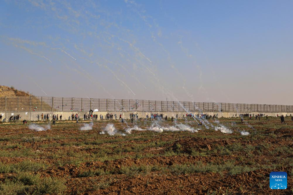 Tear gas canisters are fired by Israeli soldiers toward Palestinians during clashes following a protest to mark the 54th anniversary of the burning of Al-Aqsa Mosque near the fence of the Gaza-Israel border, east of Gaza City, on Aug. 21, 2023. Dozens of Palestinians were injured on Monday during clashes with the Israeli soldiers at the Gaza border with Israel and the West Bank, Palestinian medics and eyewitnesses said. (Photo by Rizek Abdeljawad/Xinhua)