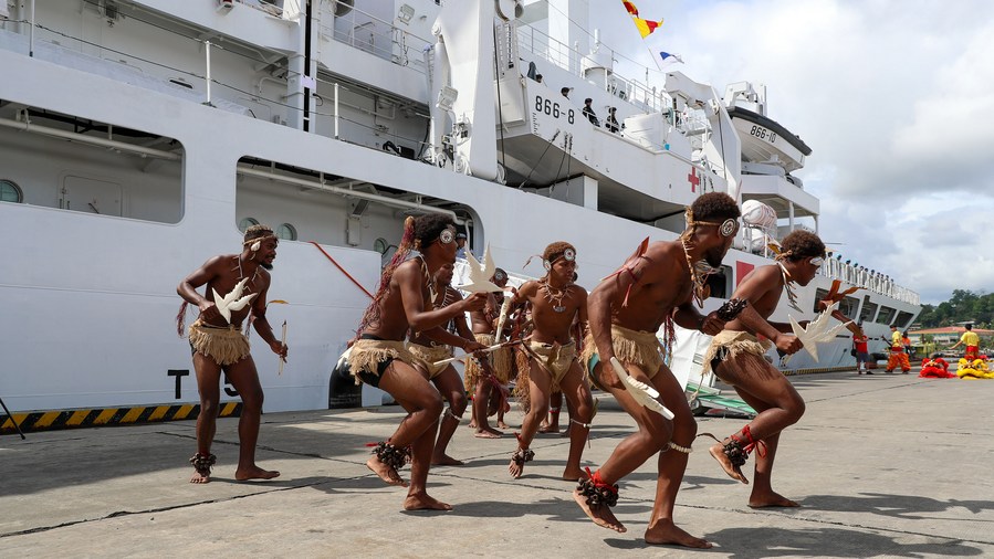 People in traditional costumes perform dance to welcome the Chinese naval hospital ship Peace Ark at the Honiara Port in Honiara, the capital of the Solomon Islands on Aug. 19, 2023. (Xinhua/Li Yu)