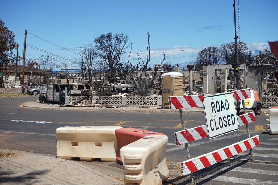 This photo taken on Aug. 20, 2023 shows the aftermath of wildfires in Lahaina town, Maui Island, Hawaii, the United States. The death toll from the Maui wildfires in Hawaii reached 114 on Friday, the deadliest fires in modern U.S. history, authorities said. (Photo by Zeng Hui/Xinhua)