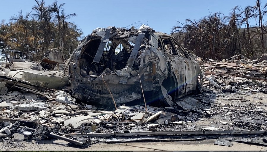 The photo taken with a mobile phone on Aug. 14, 2023 shows a vehicle destroyed in a wildfire in Lahaina town, Maui Island, Hawaii, the United States. The death toll from the Maui wildfires reached 99, authorities said Monday. (Photo by Yang Pingjun/Xinhua)