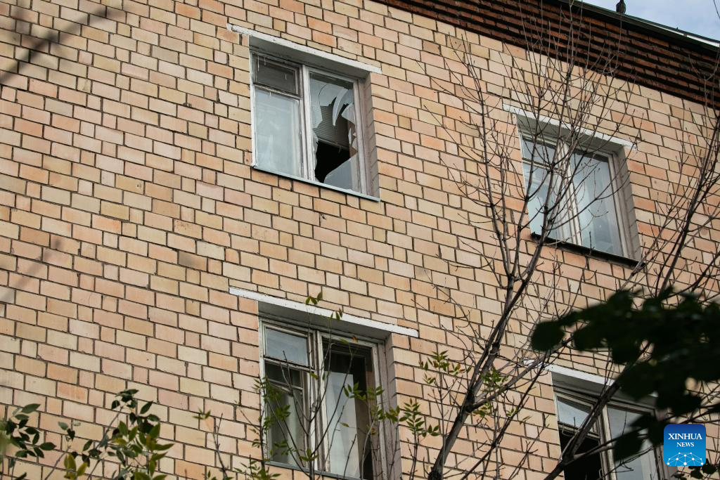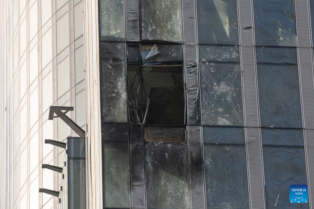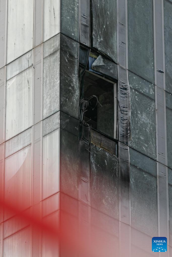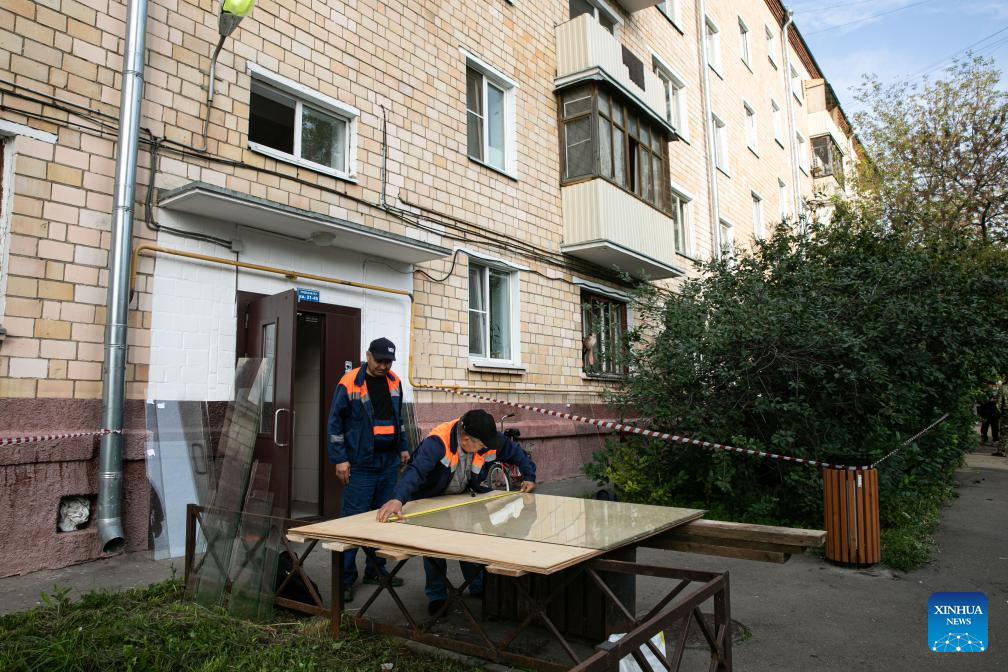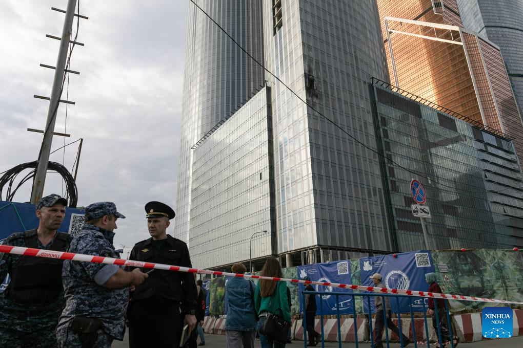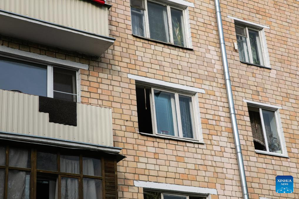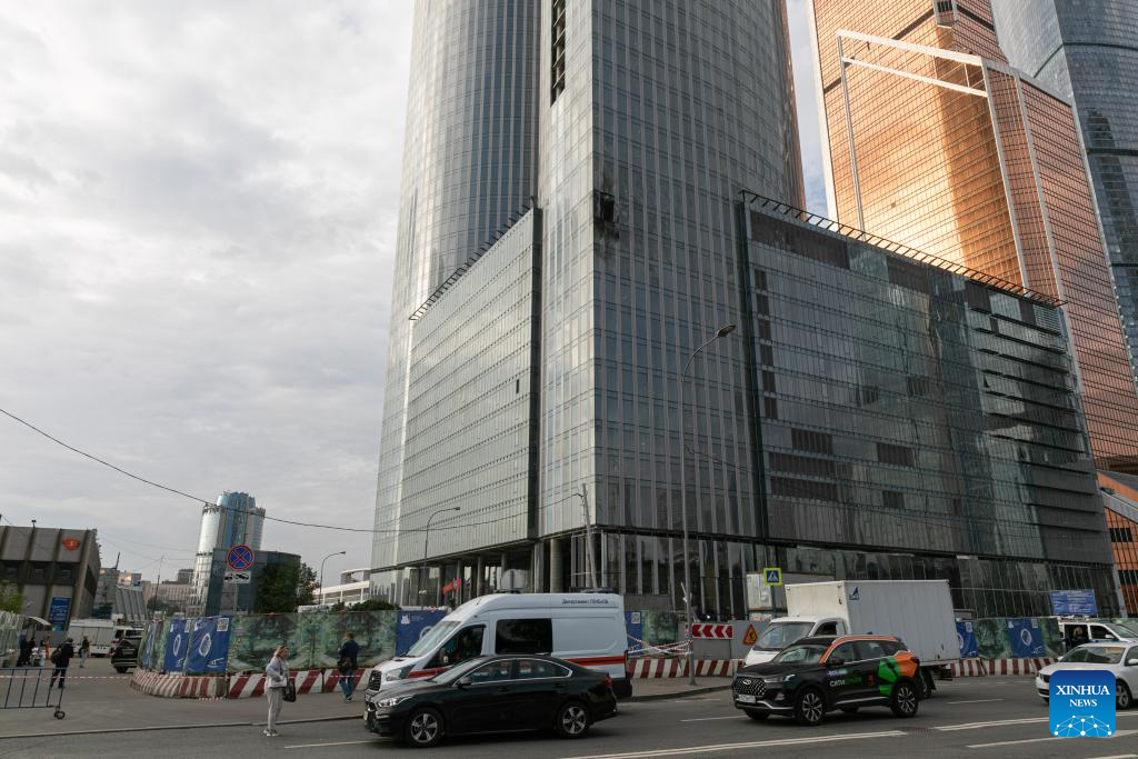 This photo taken on Aug. 23, 2023 shows the damaged building following a reported drone attack in Moscow, Russia. Russia has thwarted an attempt by Ukraine to attack Moscow with three drones, said the defense ministry Wednesday. (Xinhua/Bai Xueqi)