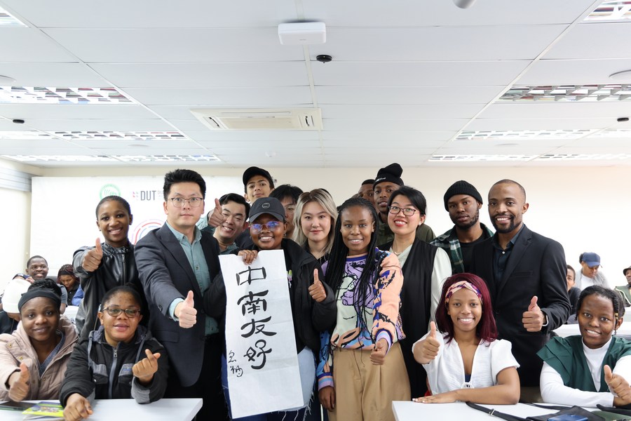 This photo released by the Confucius Institute at Durban University of Technology on Aug. 18, 2023 shows faculty and students of the institute displaying a calligraphic work which reads "China-South Africa friendship" in Chinese. (Confucius Institute at Durban University of Technology/Handout via Xinhua)