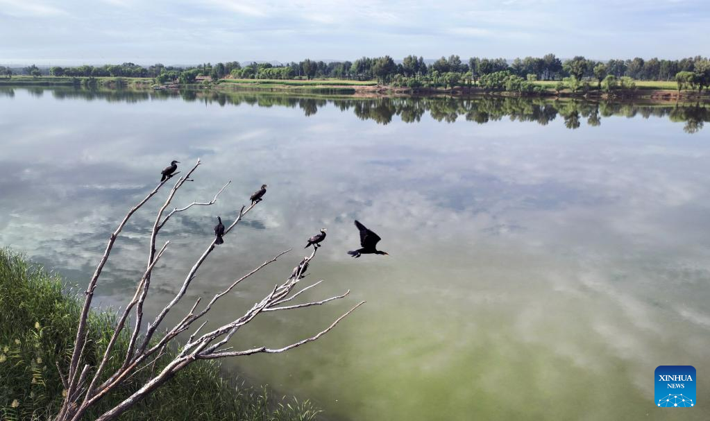 This aerial photo taken on Aug. 19, 2023 shows birds resting on a tree near Luhe River in Jingbian County, Yulin City of northwest China's Shaanxi Province. Luhe River, dubbed a "mother river" in Jingbian County, plays an important role in agricultural production in northern Shaanxi. (Photo by Zhang Lan/Xinhua)