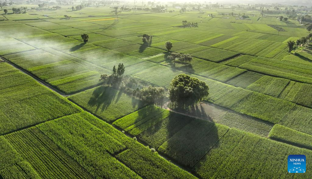 This aerial photo taken on Aug. 18, 2023 shows corn fields near Luhe River in Jingbian County, Yulin City of northwest China's Shaanxi Province. Luhe River, dubbed a "mother river" in Jingbian County, plays an important role in agricultural production in northern Shaanxi. (Photo by Zhang Lan/Xinhua)