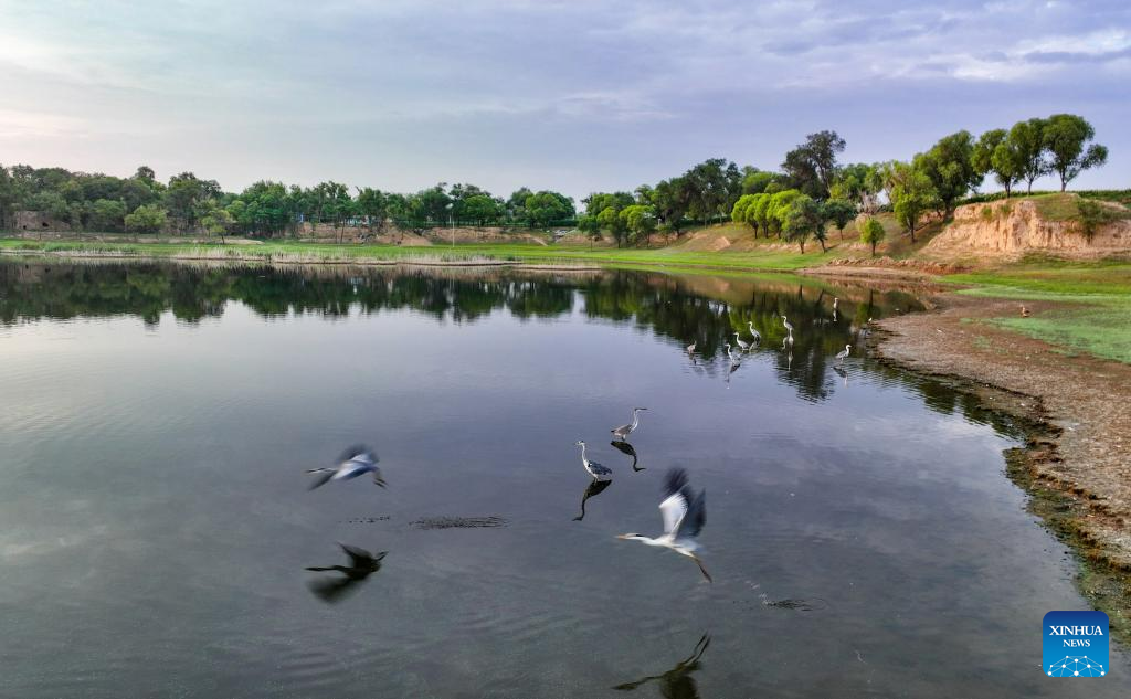 This aerial photo taken on Aug. 20, 2023 shows birds foraging in Luhe River in Jingbian County, Yulin City of northwest China's Shaanxi Province. Luhe River, dubbed a "mother river" in Jingbian County, plays an important role in agricultural production in northern Shaanxi. (Photo by Zhang Lan/Xinhua)