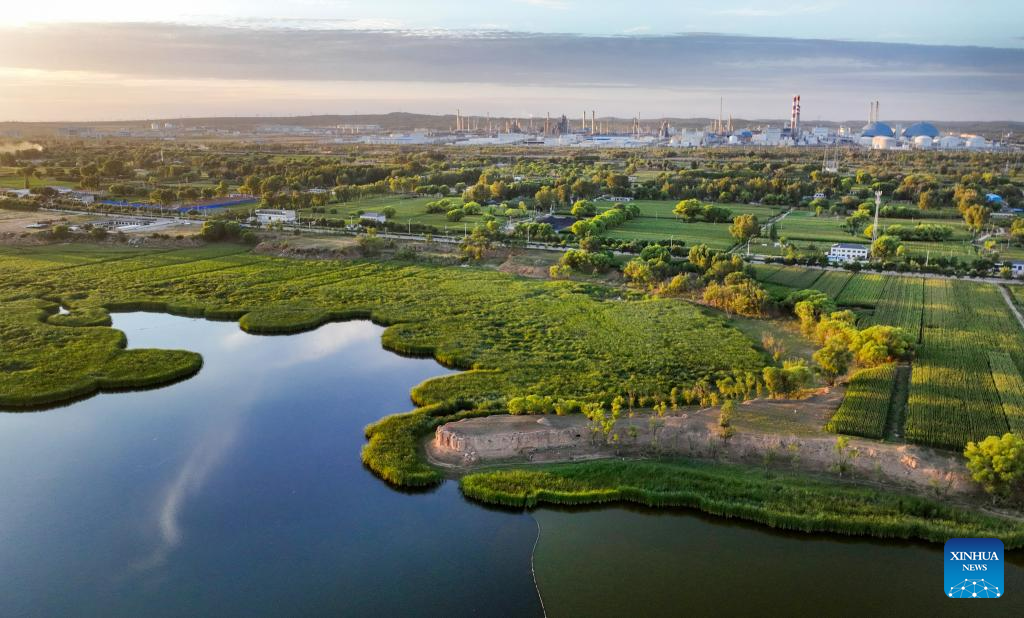 This aerial photo taken on Aug. 20, 2023 shows the scenery of Luhe River in Jingbian County, Yulin City of northwest China's Shaanxi Province. Luhe River, dubbed a "mother river" in Jingbian County, plays an important role in agricultural production in northern Shaanxi. (Photo by Zhang Lan/Xinhua)