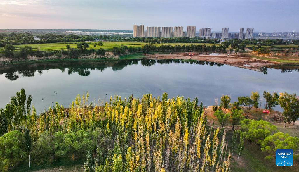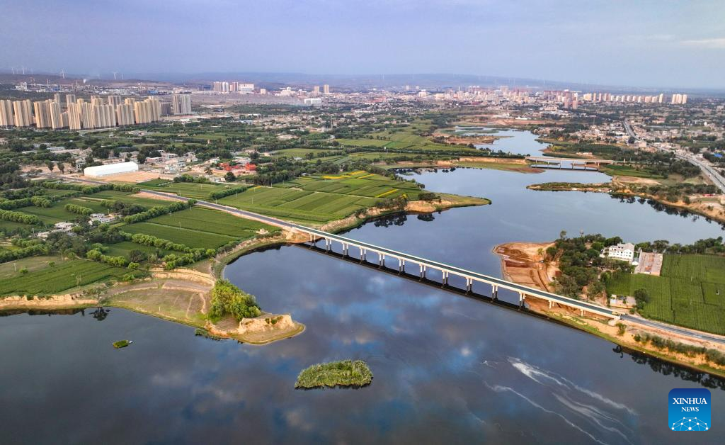 This aerial photo taken on Aug. 18, 2023 shows a view of Luhe River in Jingbian County, Yulin City of northwest China's Shaanxi Province. Luhe River, dubbed a "mother river" in Jingbian County, plays an important role in agricultural production in northern Shaanxi. (Photo by Zhang Lan/Xinhua)