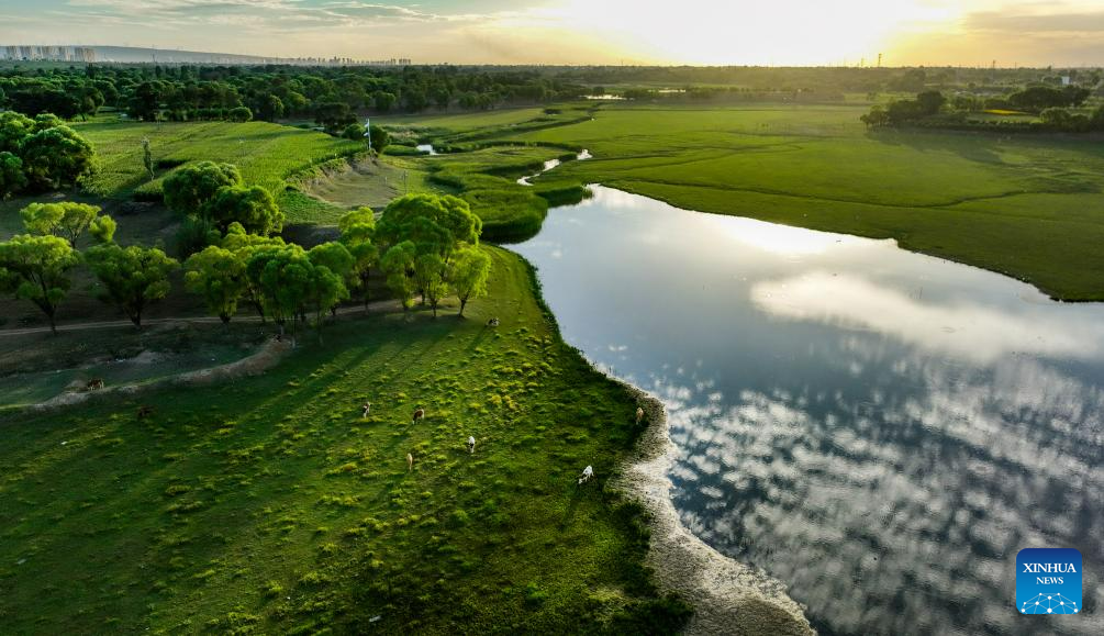 This aerial photo taken on Aug. 20, 2023 shows sunrise scenery at Luhe River in Jingbian County, Yulin City of northwest China's Shaanxi Province. Luhe River, dubbed a "mother river" in Jingbian County, plays an important role in agricultural production in northern Shaanxi. (Photo by Zhang Lan/Xinhua)