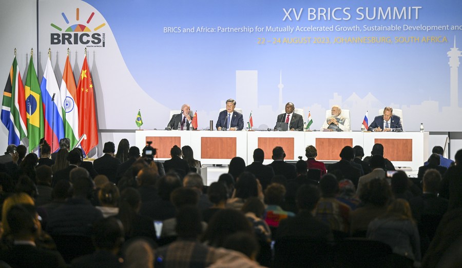 Chinese President Xi Jinping delivers an important speech at a press conference during the 15th BRICS Summit in Johannesburg, South Africa, Aug. 24, 2023. BRICS leaders agreed on Thursday to invite six countries, namely Argentina, Egypt, Ethiopia, Iran, Saudi Arabia and the United Arab Emirates (UAE), to join the group. (Xinhua/Ding Haitao)