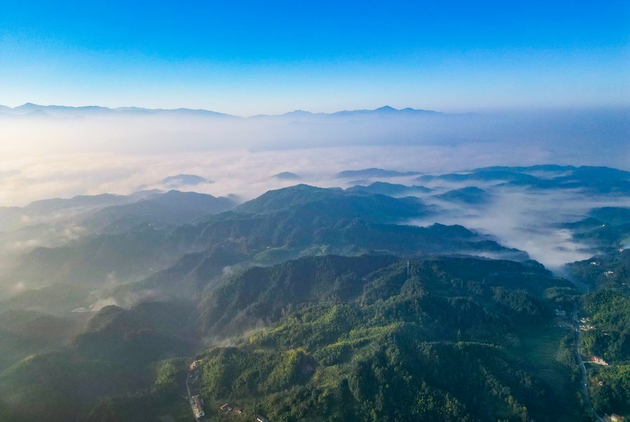 This aerial photo taken on Aug. 23, 2023 shows mountain scenery in Manshuihe Town of Lu'an City, east China's Anhui Province. (Xinhua/Guo Chen)
