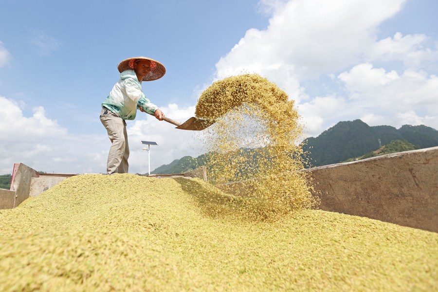 A farmer loads the harvested rice to a truck at a hybrid rice seed production base in Cengong County, Qiandongnan Miao and Dong Autonomous Prefecture, southwest China's Guizhou Province, Aug. 23, 2023. (Photo by Tang Peng/Xinhua)
