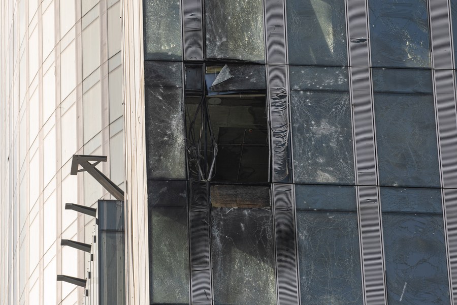 This photo taken on Aug. 23, 2023 shows the damaged building following a reported drone attack in Moscow, Russia. Russia has thwarted an attempt by Ukraine to attack Moscow with three drones, said the defense ministry Wednesday. The Russian air defense forces, it said, intercepted and destroyed two drones over the Mozhaysky and Khimki districts of the Moscow region, while the third one was jammed by electronic warfare and crashed into a building under construction in the Moscow-City complex. No casualties were reported, the ministry said. (Xinhua/Bai Xueqi)