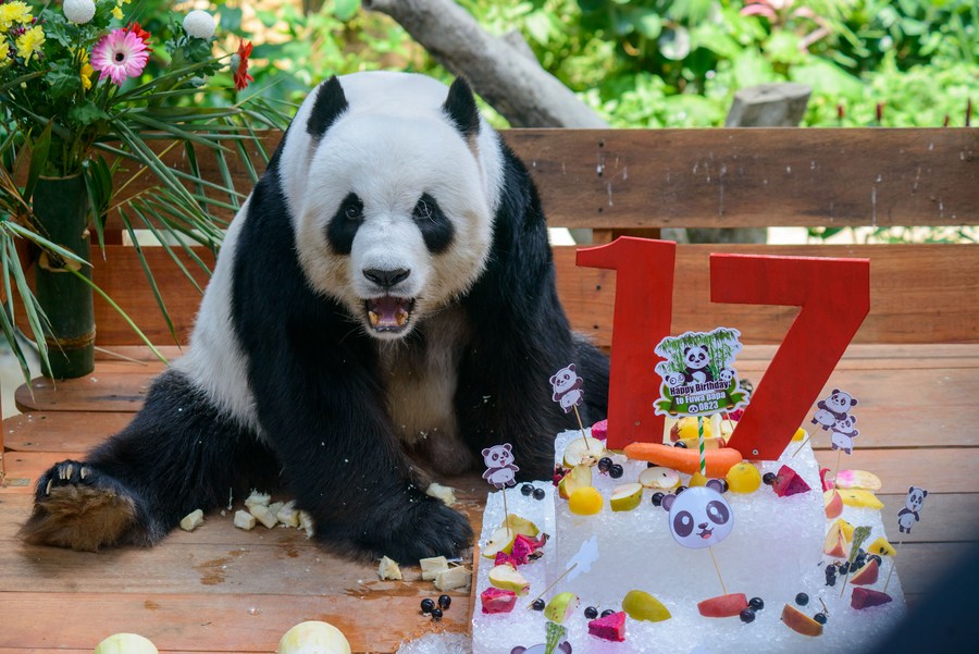 Giant panda Xing Xing enjoys birthday treats at the Giant Panda Conservation Center in Zoo Negara near Kuala Lumpur, Malaysia, Aug. 23, 2023. Giant panda couple Xing Xing and Liang Liang continue to play their role as "ambassadors" to Malaysia as the couple turned 17 on Wednesday. (Photo by Chong Voon Chung/Xinhua)■