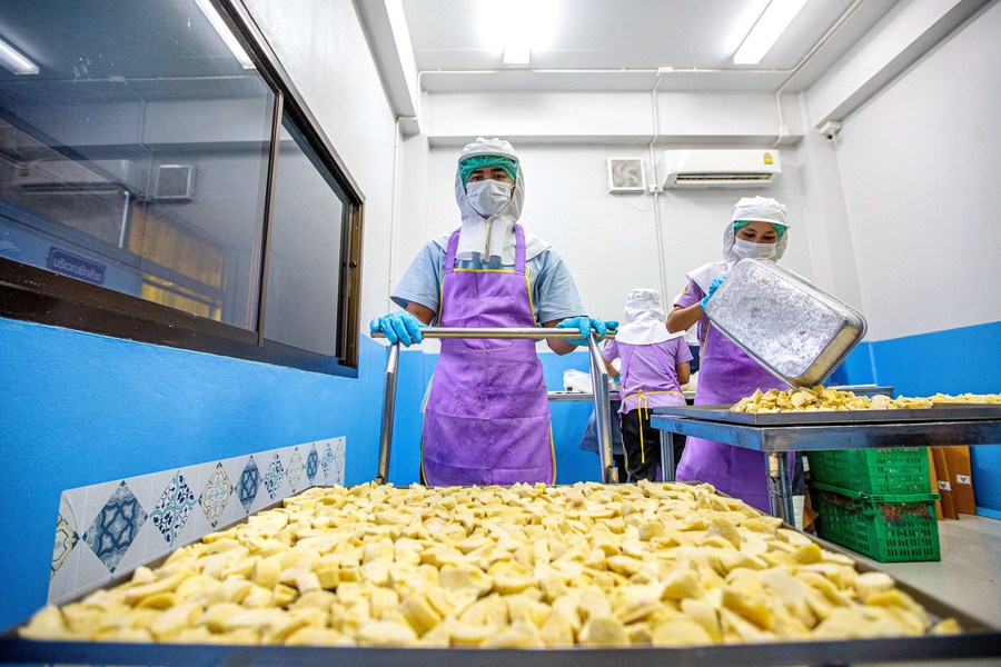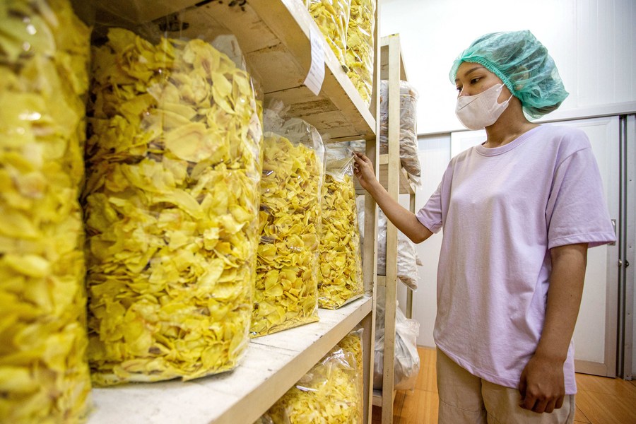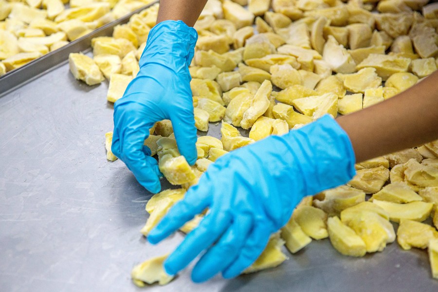 A staff member checks freeze-dried durian products at a fruit products company in Chanthaburi Province, Thailand, Aug. 17, 2023. (Xinhua/Wang Teng)