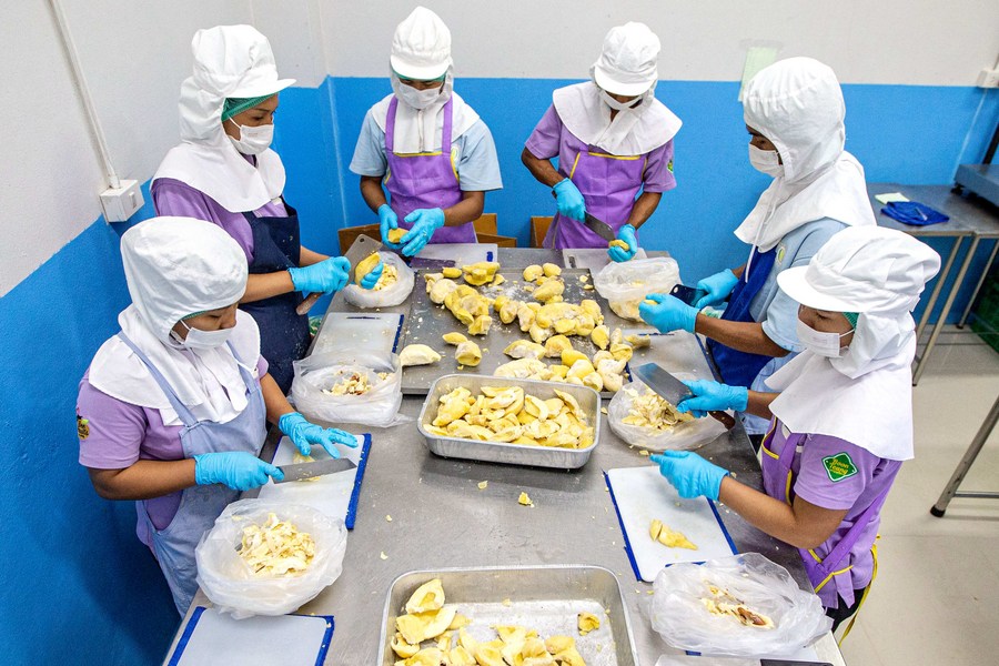 Staff members cut durian pulps at a fruit products company in Chanthaburi Province, Thailand, Aug. 17, 2023. (Xinhua/Wang Teng)