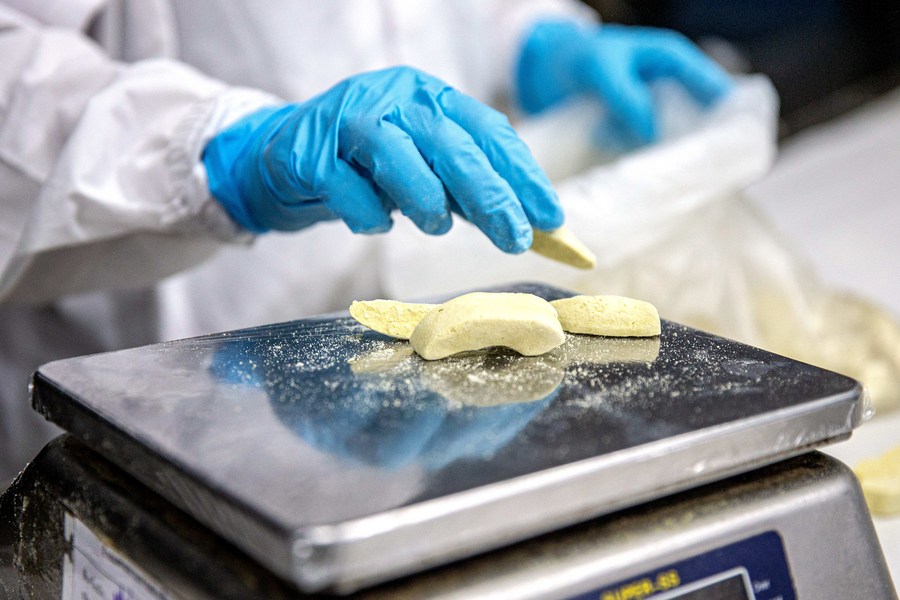 A staff member weighs freeze-dried durian pulps at a fruit products company in Chanthaburi Province, Thailand, Aug. 17, 2023. (Xinhua/Wang Teng)