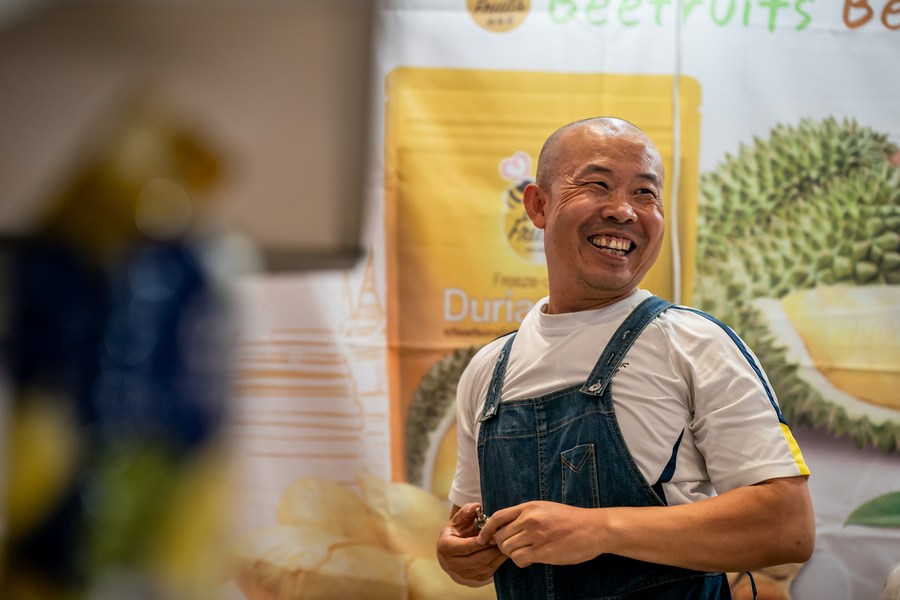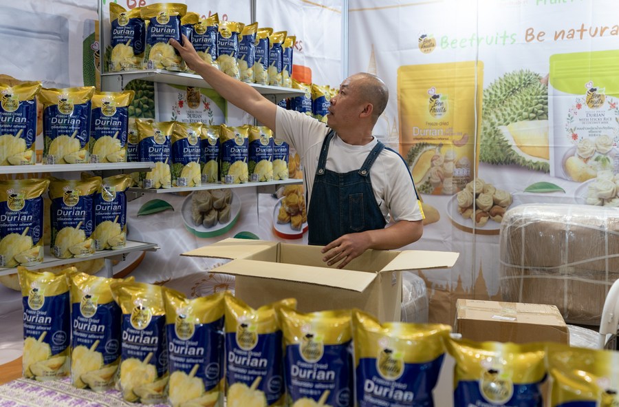 This photo taken on Aug. 14, 2023 shows Chen Jie arranging his freeze-dried durian products at his exhibition booth in Kunming Dianchi International Convention and Exhibition Center, the venue for the seventh China-South Asia Expo in Kunming, southwest China's Yunnan Province. (Xinhua/Chen Xinbo)