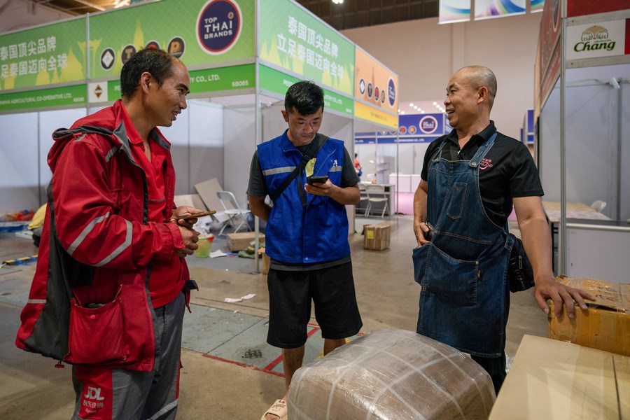 This photo taken on Aug. 20, 2023 shows Chen Jie (R) talking with express delivery staff after the seventh China-South Asia Expo closed in Kunming, southwest China's Yunnan Province. (Xinhua/Chen Xinbo)■