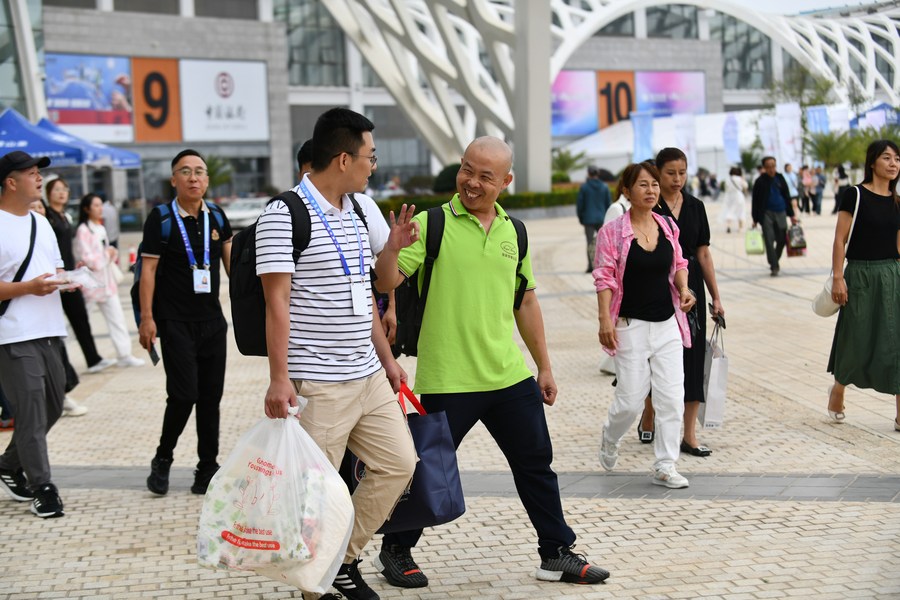 This photo taken on Aug. 18, 2023 shows Chen Jie (in the green shirt) walking out of Kunming Dianchi International Convention and Exhibition Center, the venue for the seventh China-South Asia Expo in Kunming, southwest China's Yunnan Province. (Xinhua/Chen Xinbo)