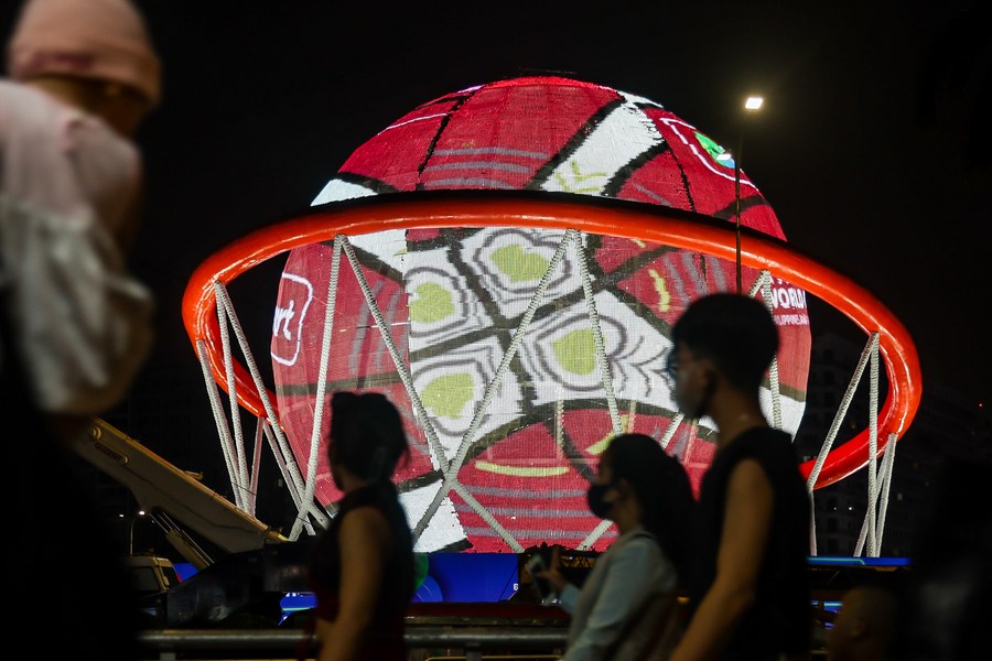 People walk past a giant FIBA Basketball World Cup themed display in Pasay City, the Philippines, Aug. 24, 2023. The FIBA Basketball World Cup 2023 will be held from Aug. 25 to Sept. 10, 2023. (Xinhua/Rouelle Umali)