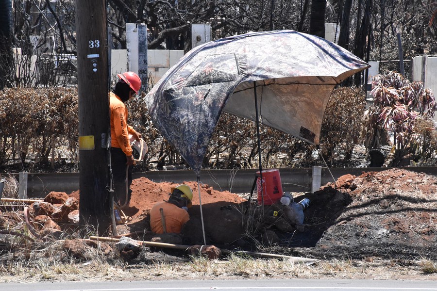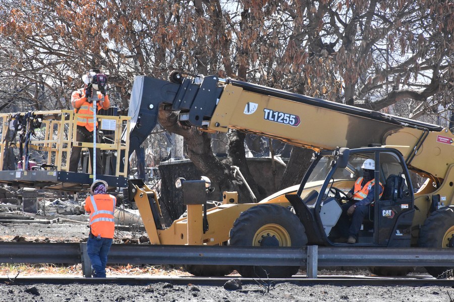 Workers are seen in fire-ravaged Lahaina town, Maui Island, Hawaii, the United States, Aug. 22, 2023. (Xinhua/Gao Shan)