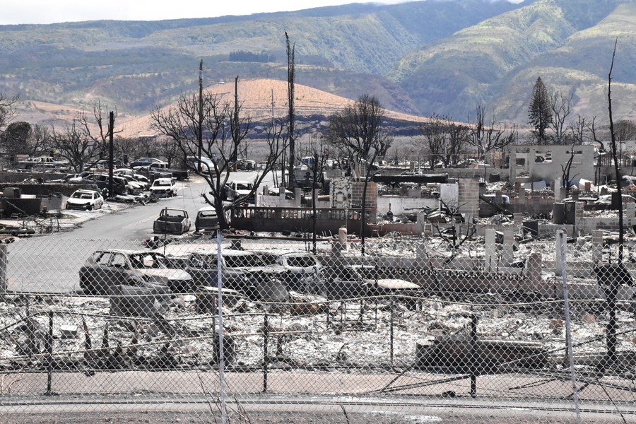 This photo taken on Aug. 20, 2023 shows the aftermath of wildfires in Lahaina town, Maui Island, Hawaii, the United States. (Photo by Zeng Hui/Xinhua)