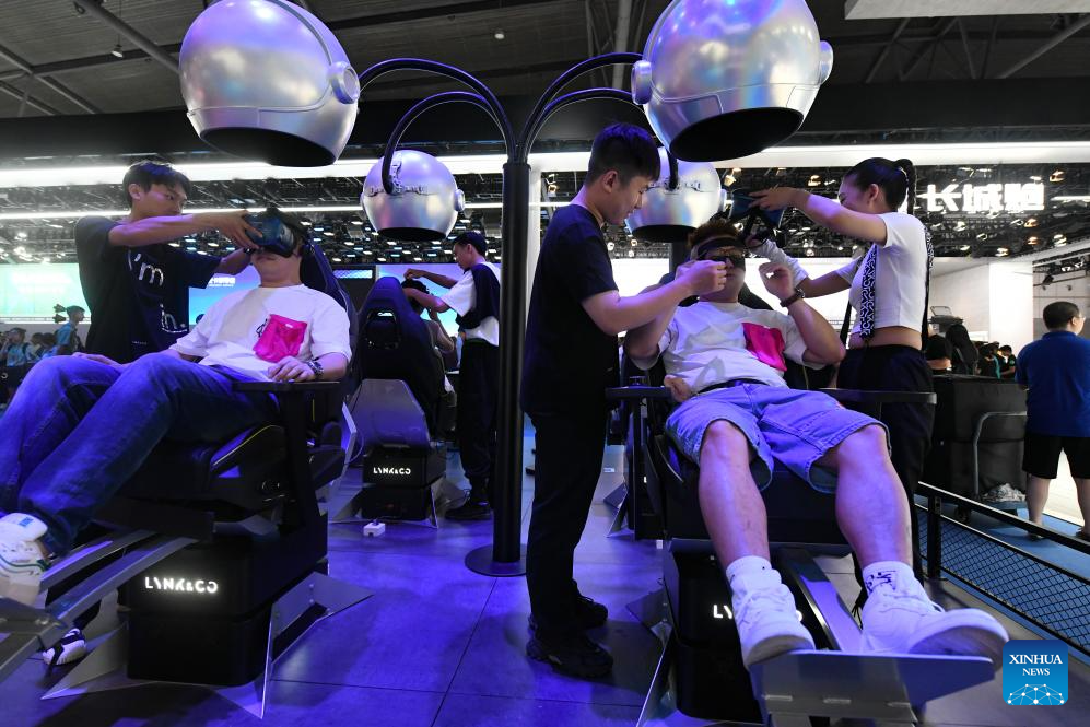 Visitors try VR driving simulation devices during Chengdu Motor Show 2023 in Chengdu, southwest China's Sichuan Province, Aug. 25, 2023. The Chengdu Motor Show 2023 kicked off here on Friday. Some 1,600 cars of more than 120 brands from home and abroad are exhibited at the show. (Xinhua/Tang Wenhao)
