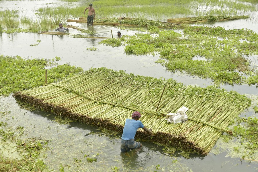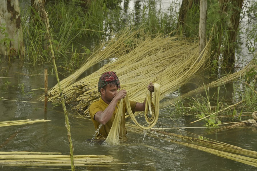A farmer harvests jute in Manikganj district, Bangladesh, on Aug. 23, 2023. (Xinhua)