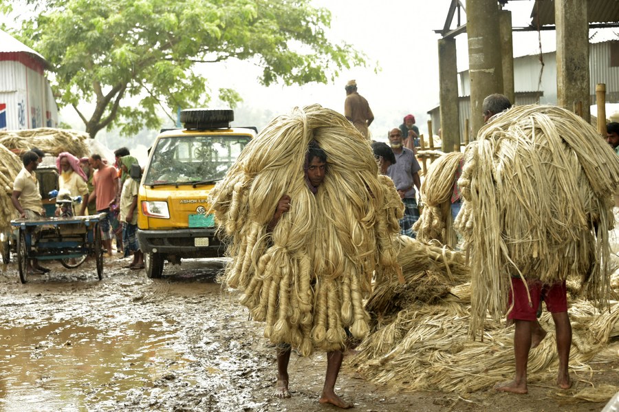 Laborers carry bundles of freshly harvest jute at a wholesale market in Manikganj district, Bangladesh, on Aug. 23, 2023. (Xinhua)