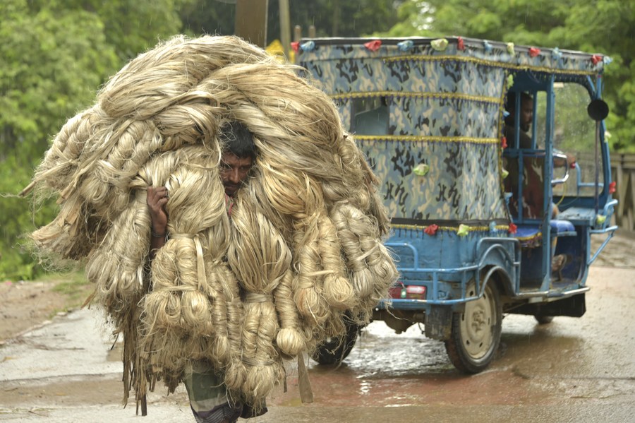 A laborer carries bundles of freshly harvest jute at a wholesale market in Manikganj district, Bangladesh, on Aug. 23, 2023. (Xinhua)