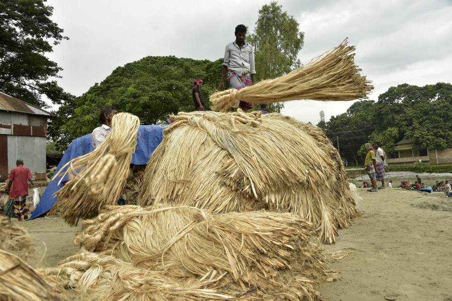 Laborers process bundles of newly harvested jute at a wholesale market in Manikganj district, Bangladesh, on Aug. 23, 2023. (Xinhua)■